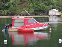 to our starting point. The Abel Tasman coastal walk is one of New Zealand’s best and while we didn’t want to do the entire 3-4 day walk we thought 3-4 hours of it was better than nothing.The water taxi was rather different. Since the tides are so high/low they actually put you in the boat while in the parking lot. A tractor then pulls you down the road to the water and out about 100 ft until there is enough water to float the boat. See the picture at right. That is a tractor leading the boat.